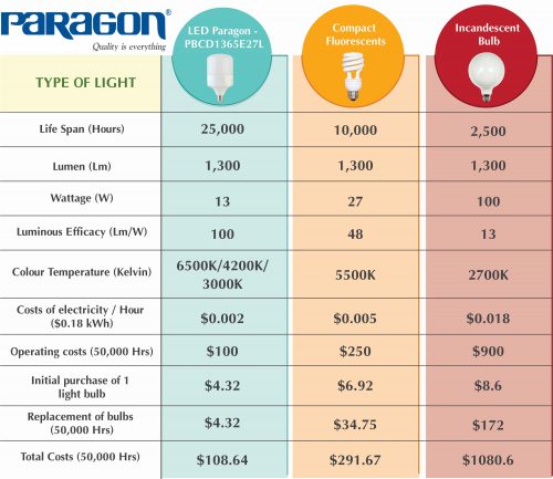 Một bóng đèn huỳnh quang bình thường có tuổi thọ từ 10.000-15.000h. Trong khi đó bóng đèn LED Tube Paragon có tuổi thọ lên đến 50.000h. Việc chuyển sang sử dụng đèn LED sẽ giúp bạn giảm đến 5 lần chi phí bảo trì, sữa chữa, thay thế các bóng đèn huỳnh quang và các phụ kiện đi kèm.