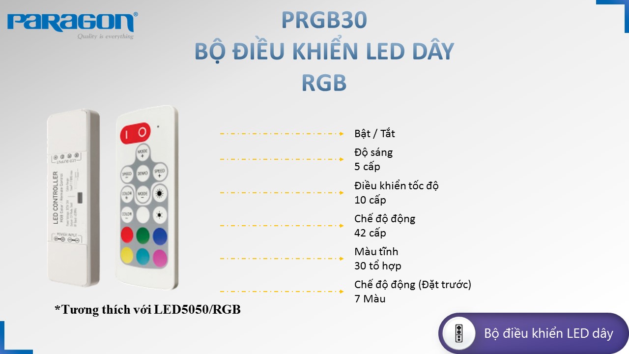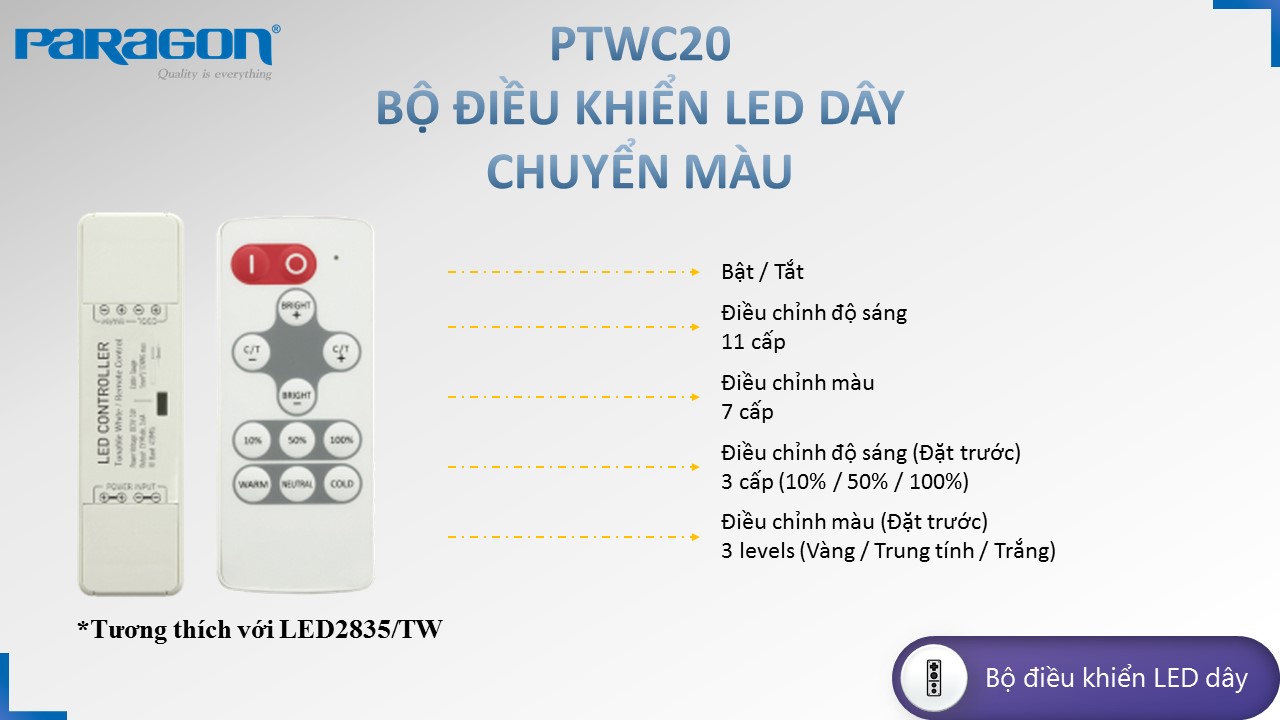 - Đèn LED dây Paragon là một dãy LED chiếu sáng đơn giản nhờ đặc tính dễ dàng cắt ngắn hoặc nối dài cho phép người dùng biến đổi kích thước phù hợp với chiều dài và nhu cầu chiều sáng.