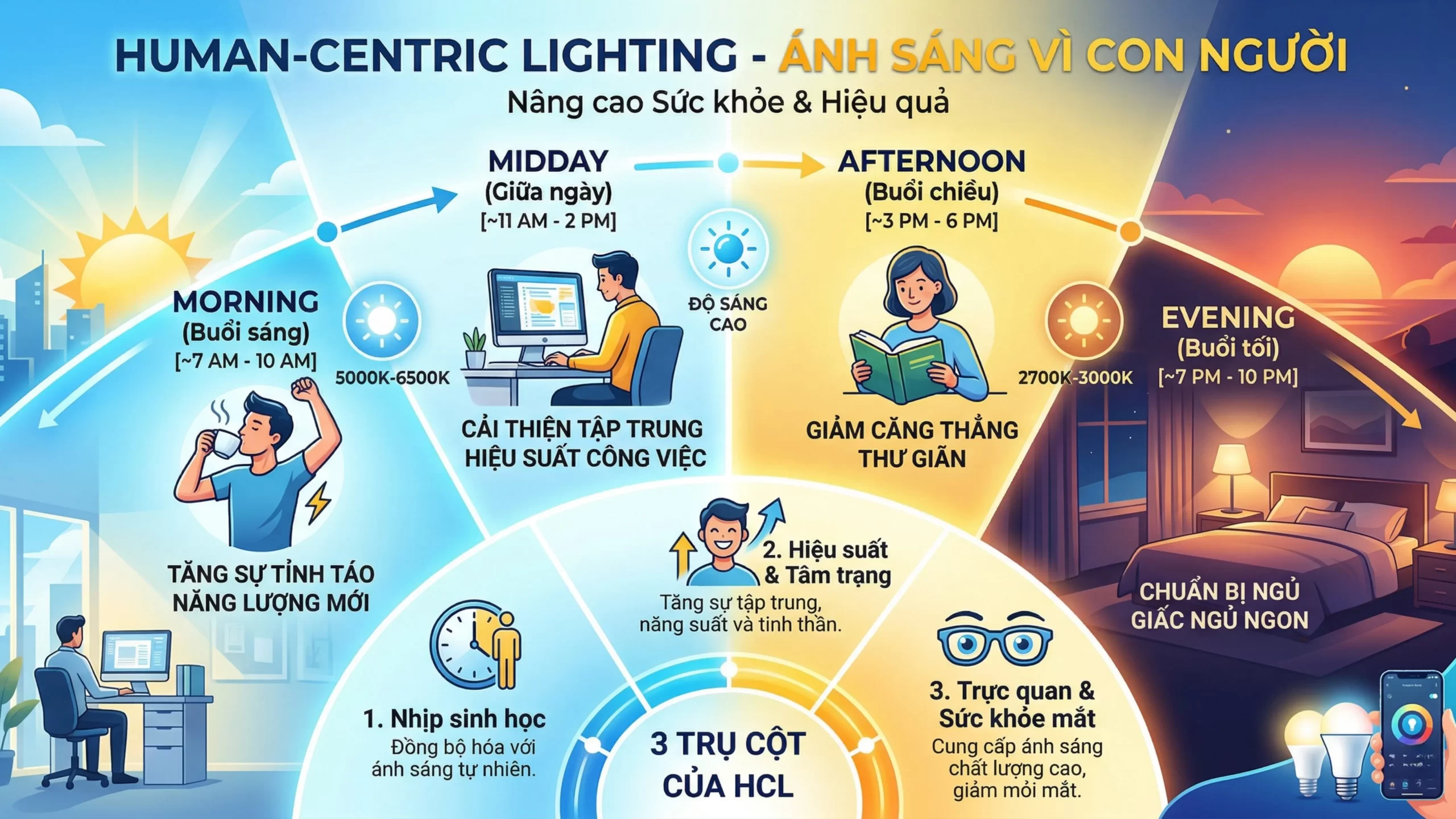 Chúng ta không chỉ đơn thuần thắp sáng không gian nữa. Ngày nay, chúng ta đang dùng ánh sáng để chủ động chăm sóc sức khỏe con người thông qua khái niệm Chiếu sáng lấy con người làm trung tâm (Human-Centric Lighting – HCL).