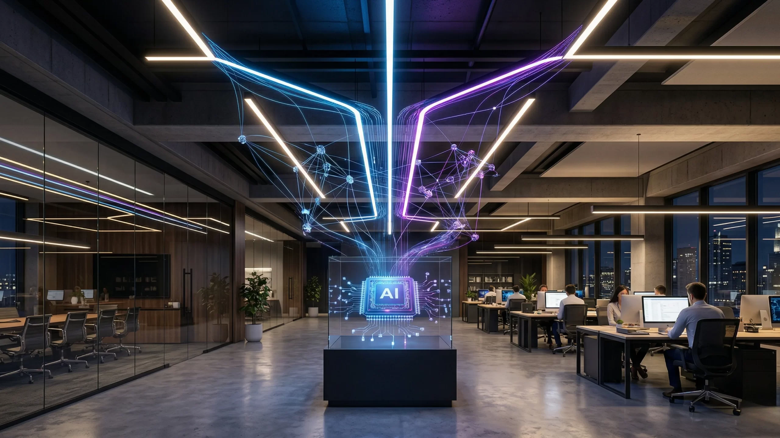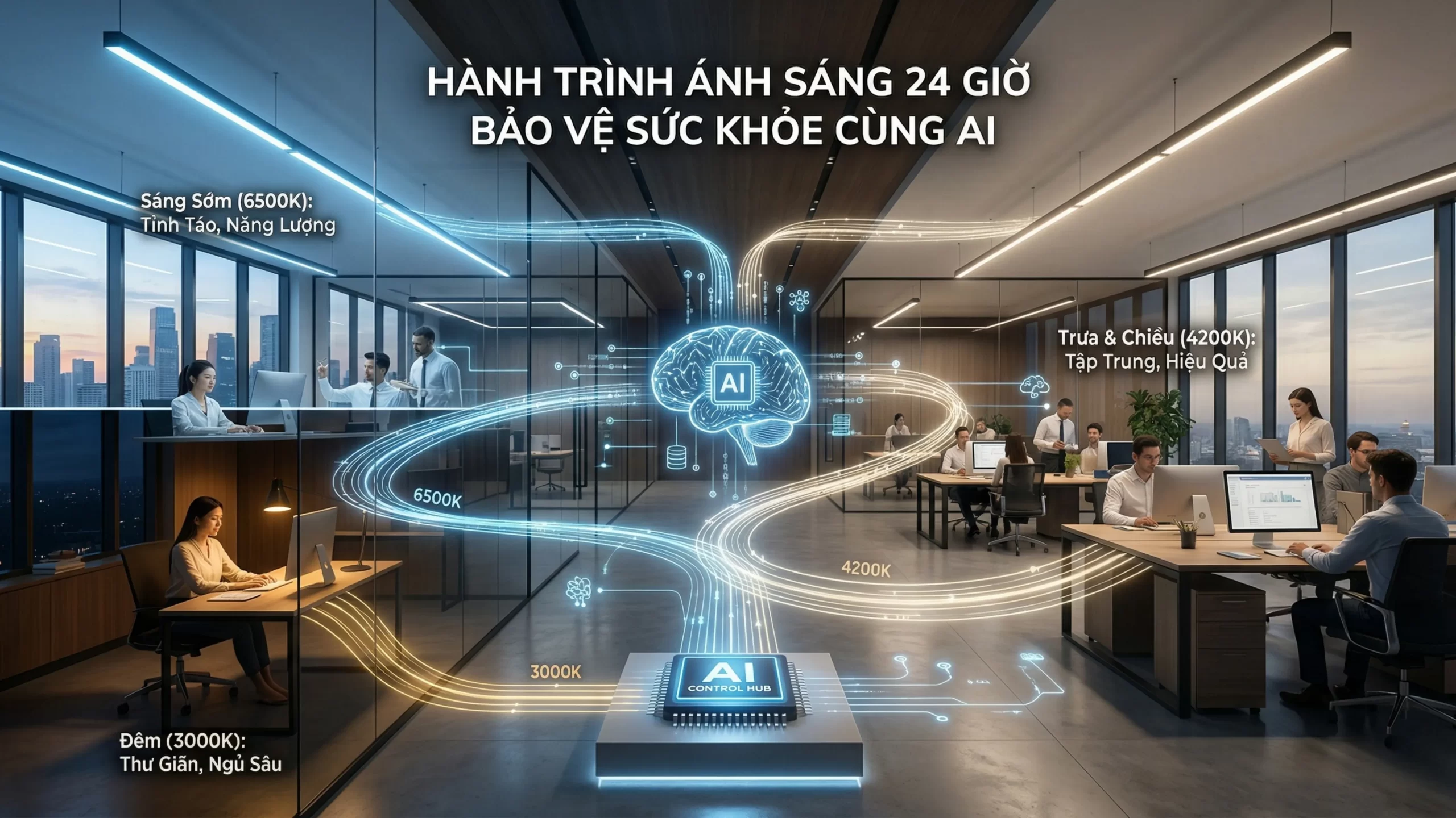 - Để hiểu rõ hơn về tính ứng dụng, chúng ta hãy xem cách AI điều khiển ánh sáng trong một ngày tiêu chuẩn. Vào buổi sáng sớm, hệ thống AI sẽ kích hoạt đèn LED ở mức 6500K với ánh sáng trắng xanh rực rỡ. Nguồn sáng này giúp ức chế hormone melatonin, kích thích não bộ tỉnh táo và tràn đầy năng lượng để bắt đầu ngày mới.